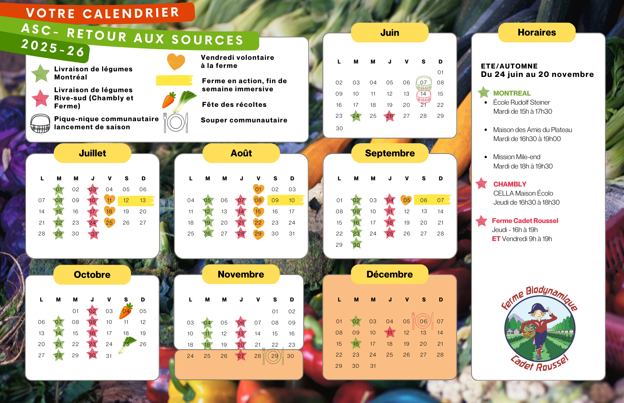 La première livraison de légumes de notre modèle « ASC-2025-2026 » aura lieu le MARDI 24 JUIN à Montréal et le JEUDI 26 JUIN sur la Rive-sud (Chambly et Ferme).