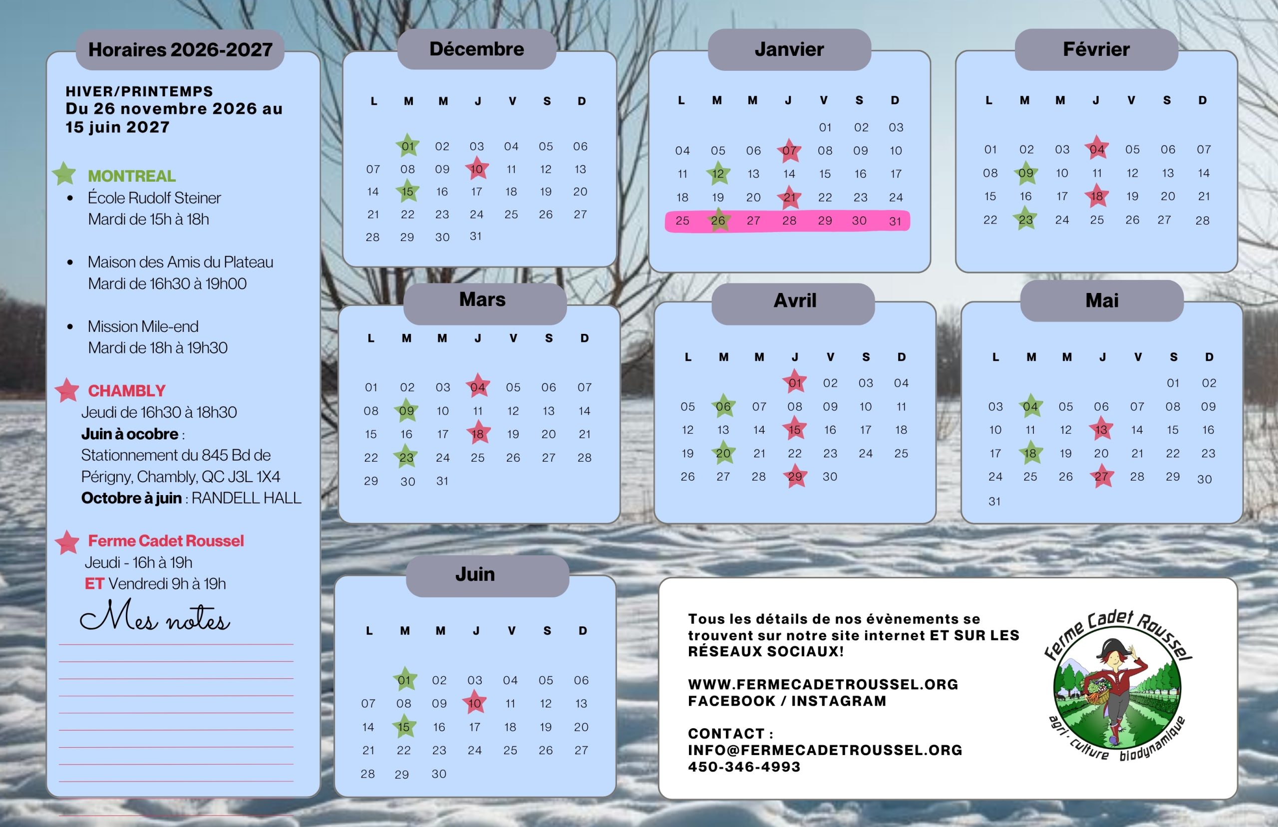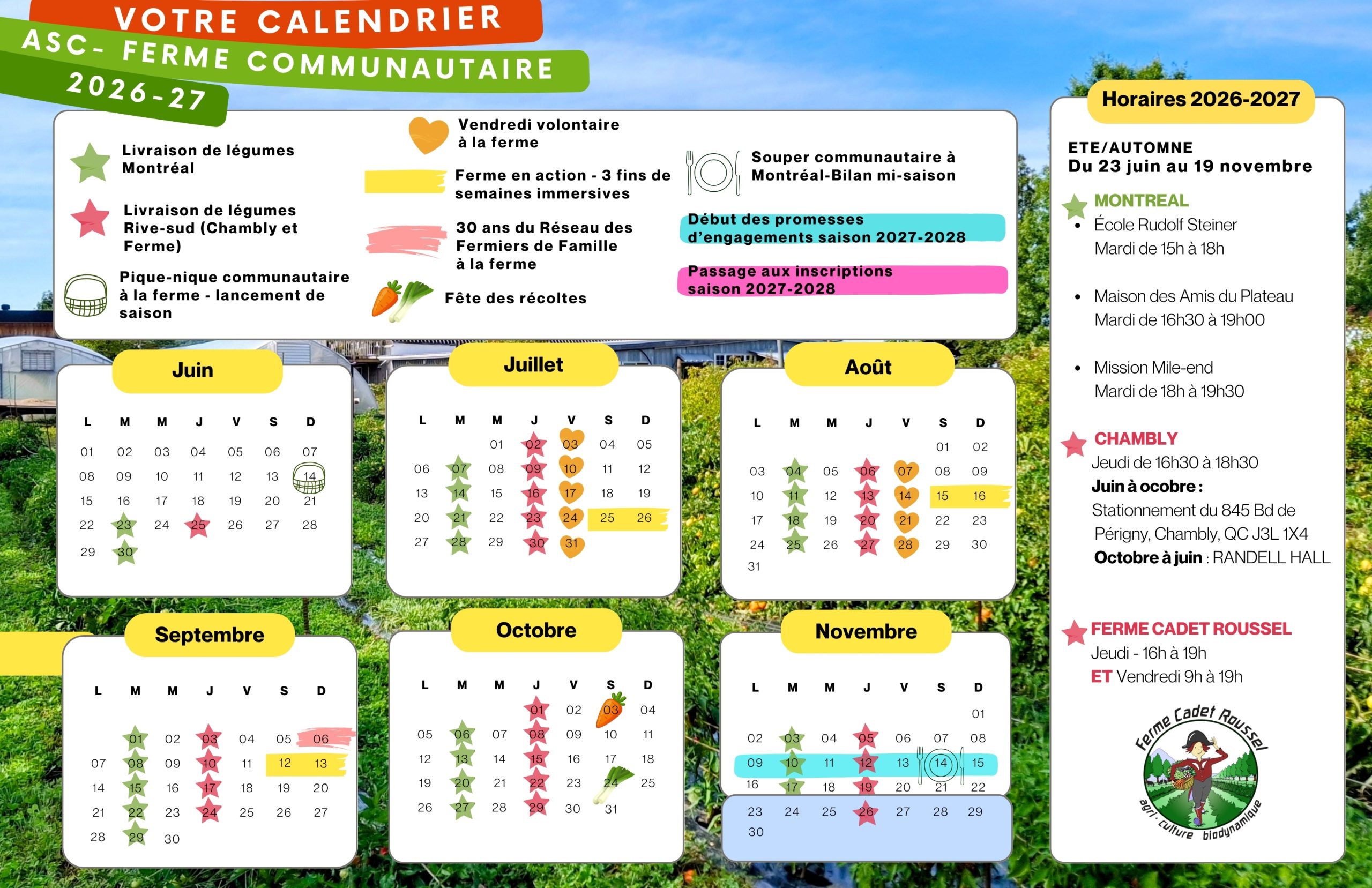 La première livraison de légumes de notre modèle « ASC-2026-2027 » aura lieu le MARDI 23 JUIN à Montréal et le JEUDI 25 JUIN sur la Rive-sud (Chambly et Ferme).