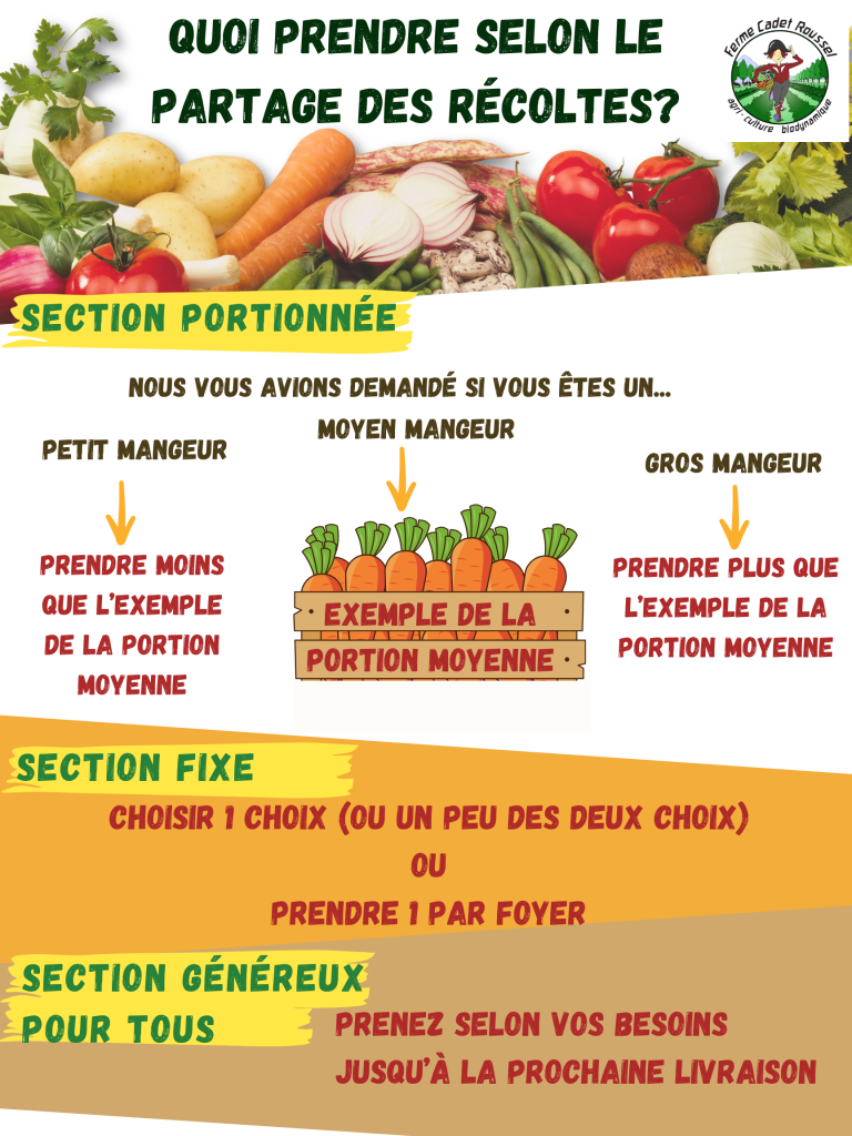 Lorsque vous venez au point de livraison, les légumes seront présentés sur un étal. Vous êtes invité à vous servir selon ces 3 indications: »Généreux » (à prendre selon vos besoins jusqu’à la livraison suivante), »au choix’‘ (entre deux ou trois légumes) et »portionné » qui correspond à un moyen mangeur (1 casseau en bois d’environ 1kg). Si vous êtes un petit mangeur vous devriez prendre moins, si vous êtes un gros mangeur vous pourriez prendre plus. En cours de saison, si vous sentez que cela change par rapport à ce que vous répondez ici, merci de nous communiquer le changement par courriel, afin de nous permettre d’ajuster la quantité de légumes à apporter aux points de livraisons!
