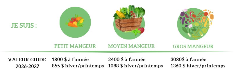 Considérant ce que vous mangez de légumes (petit, moyen, gros) et le montant que vous pouvez ou souhaitez contribuer, vous choisissez combien vous donnez à votre ferme en suivant ces valeurs guides, ou non. C’est vous qui déterminez votre prix, si vous voulez donner plus ou moins.